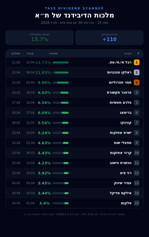 110 חברות שהכריזו על חלוקה ב-30 יום הן נתון חריג, שמשקף רווחיות חזקה במשק הישראלי. התשואות נעות מ-1.2% ועד 13.7% - טווח רחב שמספר סיפור מעניין על הבורסה בתל אביב באביב 2026.
