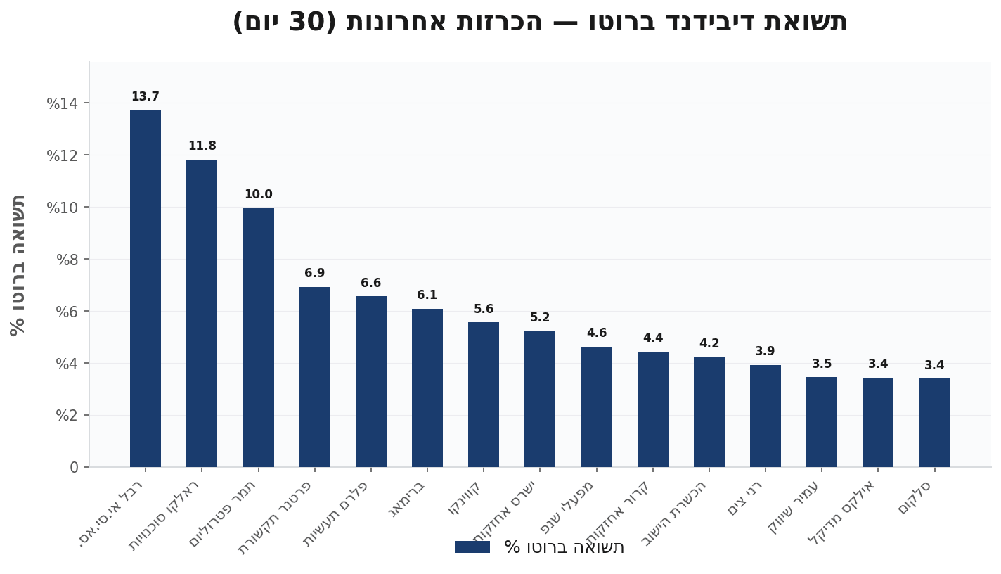 הנתונים מבוססים על הכרזות הדיבידנד מ-30 הימים האחרונים. תשואות מחושבות להכרזה בודדת ואינן תשואה שנתית. אין לראות באמור המלצה לפעולה בניירות ערך.